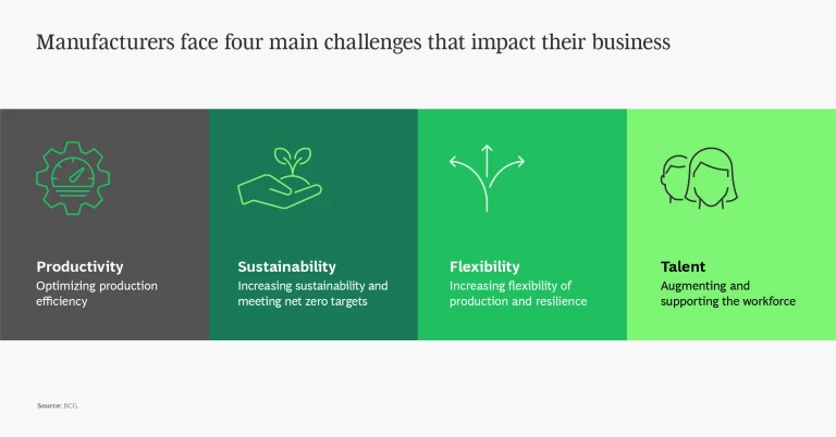 Manufacturers face a tough set of challenges right now. They need to boost productivity in their factories, but also reduce their environmental footprint. They have to be more flexible and adaptable to successfully respond to rapidly changing market conditions. And they are struggling to recruit, upskill, and retain top talent. Tackling any one of these challenges is hard; addressing them all requires a new approach.