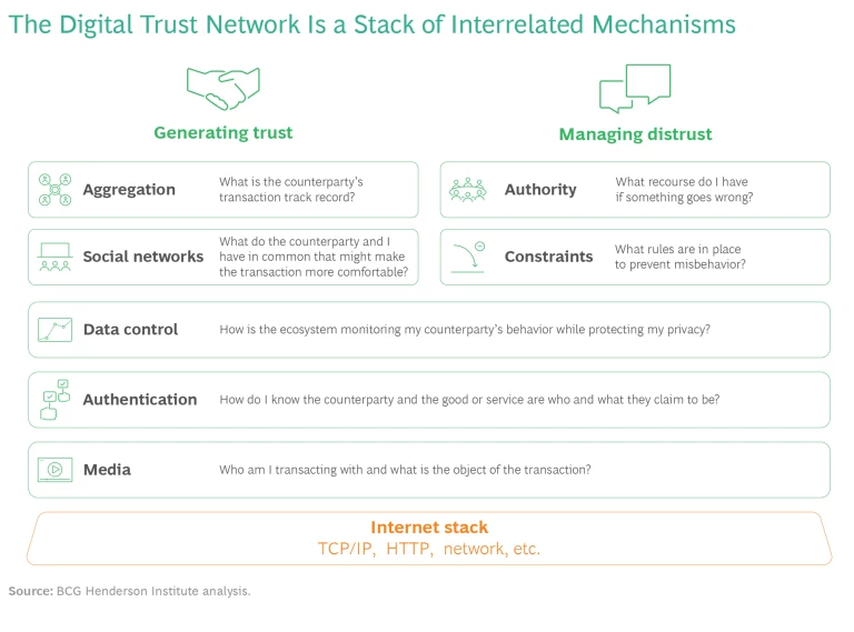 Our DTN framework breaks trust into seven layers, providing leaders with a methodical approach to addressing and understanding the complex concept of trust. (See the exhibit.) Similar to the structure of a tech stack, the seven layers are networked and build on one another, with the bottom layers supporting the top ones. No single layer can solve for trust: it is end-to-end trustworthiness that matters to users, and that can be achieved only through a comprehensive trust architecture. (Blockchain, often touted as a silver bullet for establishing trust, cannot foster end-to-end trust.) By selecting tools and tactics—which can be digital or analog—to address each of the seven layers, leaders can ensure that trust is systematically engineered throughout their ecosystem, allowing users to seamlessly and easily transact and interrelate.