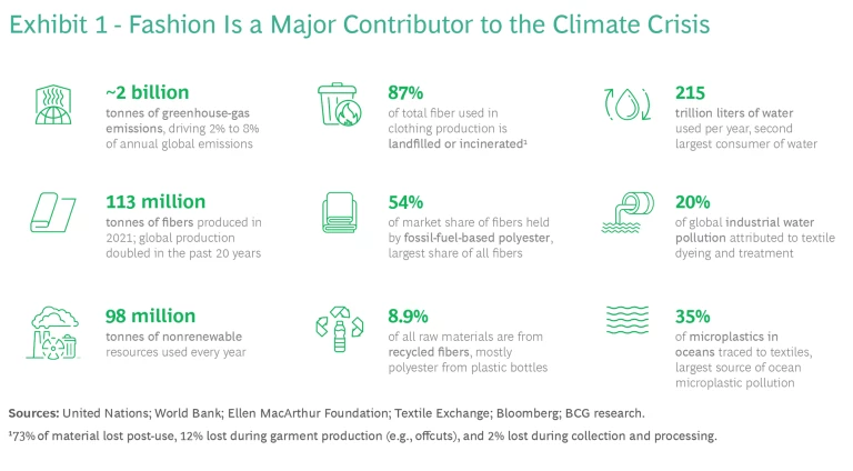 The fashion industry’s overreliance on natural resources for production, coupled with unsustainable waste management and excess production, has had a devastating impact on the environment. (See Exhibit 1.) Repercussions of the industry’s practices include deforestation, loss of biodiversity, water scarcity, soil degradation, chemical pollution, and a massive carbon footprint.