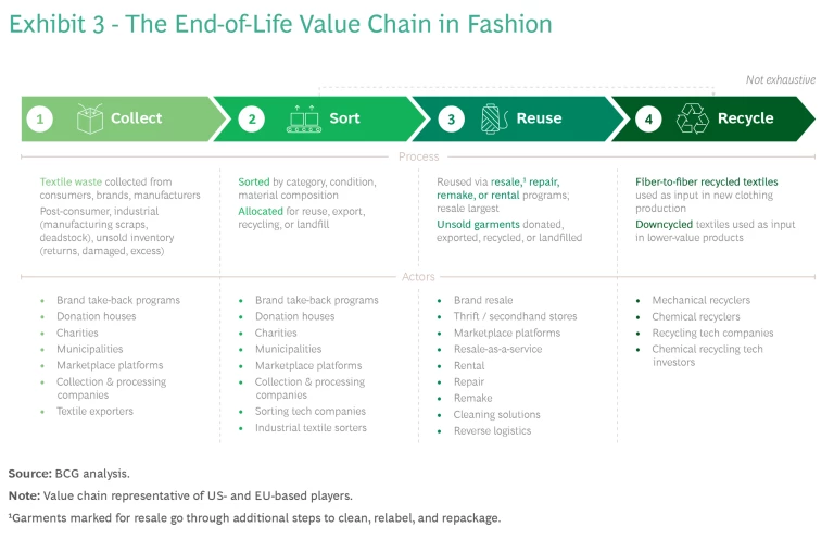 Before a garment can be recycled, it must go through a series of steps executed by several players working together. Textile waste is collected from consumer and industrial sources; sorted by category, condition, and material composition; and then designated for either reuse or recycling. (See Exhibit 3.)