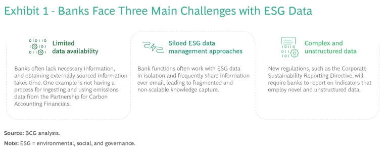 This is more data from more sources than banks have historically needed to collect, and it comes in more unstructured forms than many banks are used to, including PDF files, imagery, and web scraping. While many banks have analytics engines that can process structured and unstructured data, few have invested in mechanisms that can do so specifically for ESG data. As a result, while more users across banks need ESG data, they can’t get it in a timely way. Limited data availability, siloed data management approaches, and an inability to process complex and unstructured data are key challenges. (See Exhibit 1.) Metrics and calculations also vary widely, complicating modeling efforts and making it hard for business teams to provide clear and consistent reporting. With pressure on banks to step up leadership on ESG issues—and a burgeoning list of regulatory pronouncements—most know they need a different approach.