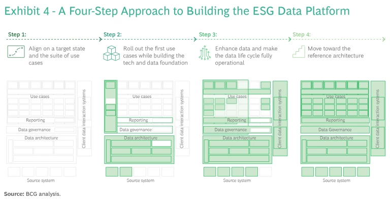 - Step 4: Move toward the reference architecture. Having established the foundational layers, banks can build on them in a modular way, use case by use case, continually adding new functionality to accommodate evolving ESG opportunities and requirements.