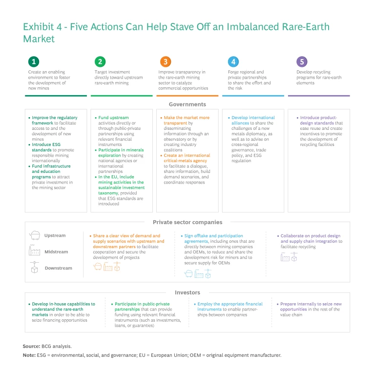 Five actions should be taken immediately to stave off an impending and troubling supply and demand imbalance. Governments will initially have to play the most prominent role, because rightsizing the rare-earth market will not occur naturally—that is, without regulations, policies, and financing from the public sector. Indeed, governments have a vested interest in making sure that domestic rare-earth projects are well supported whenever possible, chiefly to minimize their nation’s dependence on foreign countries for these critical minerals, which are about to become even more valuable. But the private sector will quickly have to show leadership for the global market to develop in a coherent fashion. (See Exhibit 4.)