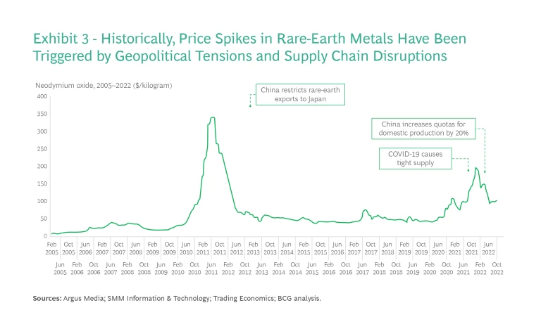 The extent of these technical issues—and the amount of effort and resources required to overcome them—has deterred investments in rare-earth projects, particularly as prices for the elements have consistently failed to rise above the breakeven target for mining them. For instance, neodymium oxide would have to be priced at roughly $150 per kilogram for a midstream project to be profitable. Yet, over the past decade, neodymium oxide has never exceeded this threshold for any significant period. (See Exhibit 3.)