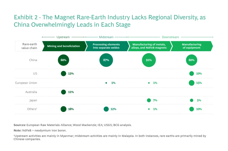The rare-earth industry can be divided into three stages: upstream, or the mining of elements; midstream, the processing of elements into separate oxides; and downstream, the manufacturing of permanent magnets and other components made with rare earths.
