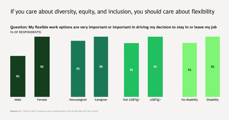 Additionally, flexible work is critical for diversity, equity, and inclusion. Roughly 90% of surveyed women, caregivers, LGBTQ+, and people with disabilities consider flexible work options important or very important in staying in or leaving their job. We saw a particularly wide gap when it comes to gender: female employees are 1.5 times more likely than their male counterparts to prioritize flexibility this way. Notably, we found only a marginal difference (3%) among women when comparing caregivers with noncaregivers. In other words, this is not just a working-mom phenomenon.