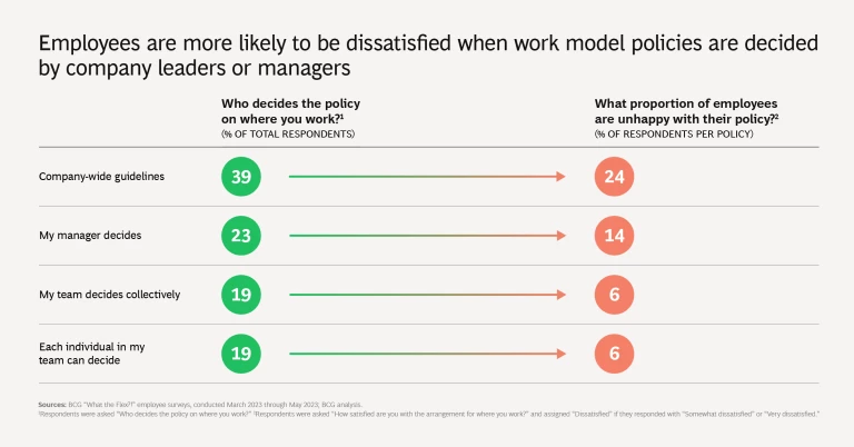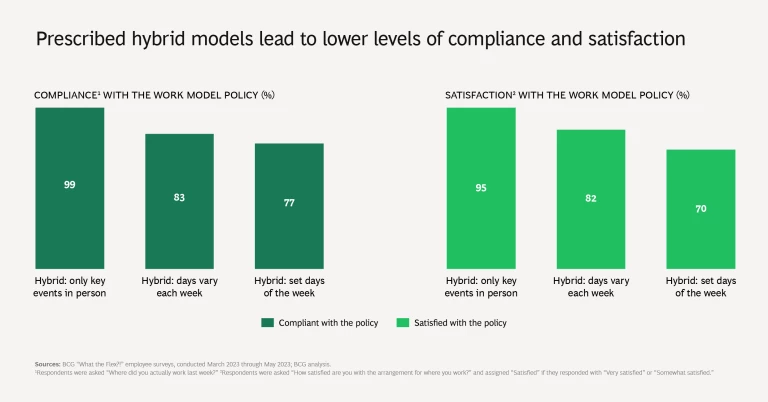 Conflating prescribed hybrid models with flexibility is also misguided. The employees who told us they work in hybrid models with set office days do not feel like they have flexibility. In fact, only 28% of them said they feel like they have significant flexibility in where they work, compared with 100% of employees working in less prescribed hybrid models.