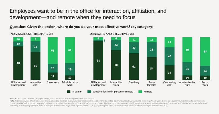 When employees come into the office, they want to know that their time is being used meaningfully. For example, respondents were eight times more likely to want to work in person for affiliation and development compared with doing focus work (such as analysis, emails, and writing reports) and administrative tasks; they often perceive the latter two categories to be more efficient when carried out remotely.