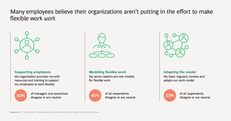 The stakes are high: nine in ten respondents consider flexible work options important when looking for a job. Moreover, many employees are willing to quit if they aren’t happy with their flexible work options. Of the employees we surveyed, those who were dissatisfied with their work model were more than 2.5 times more likely to consider leaving their organization in the next year compared with those who were satisfied.