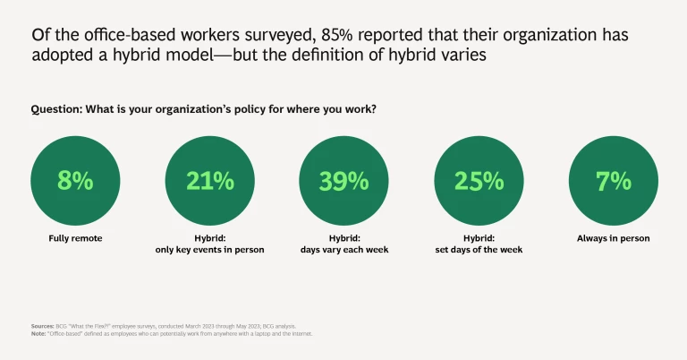 Flexible work has a definition problem. All too often, it is conflated with fully remote work, but this is not what’s happening in most organizations. The majority of our respondents reported working in a hybrid model. And even in fully remote models, one in seven employees are choosing to come into the office on some days.
