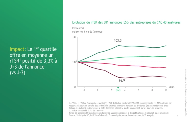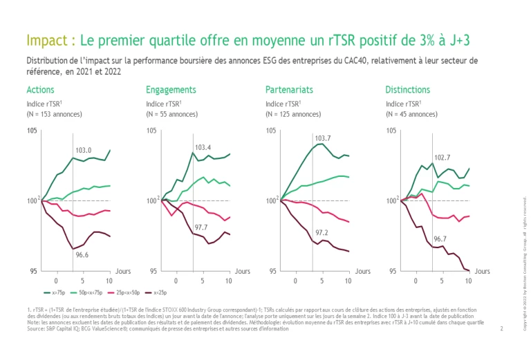 Note : l’analyse est faite en excluant les annonces ESG des entreprises ayant publié dans les 3 jours précédant l’annonce ESG ou les 10 jours suivants une autre annonce susceptible d’influer sur son TSR (ex. résultat, dividende, autre…)