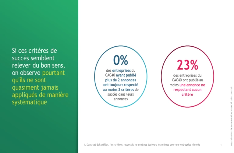 Si ces quelques critères semblent relever du bon sens, on observe pourtant qu’ils ne sont pas appliqués de manière systématique par les entreprises du CAC 40. Ainsi, parmi celles qui ont publié plusieurs annonces sur la période étudiée, aucune n’a respecté de manière systématique trois des quatre critères de succès dans ses annonces, et près d’un quart des entreprises du CAC 40 ont publié au moins une fois une annonce n’en respectant aucun.