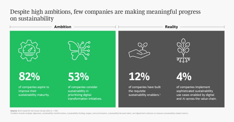 Pressure on companies to take action to slow the rate of climate change is growing from regulators, customers, investors, and other stakeholders. Yet many organizations are not delivering. In our Build for the Future research, approximately 80% of companies aspire to be sustainability leaders in the next three years, but less than 5% are systematically implementing advanced use cases to generate sustainability and societal benefits.