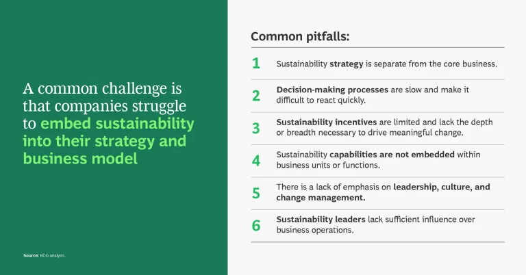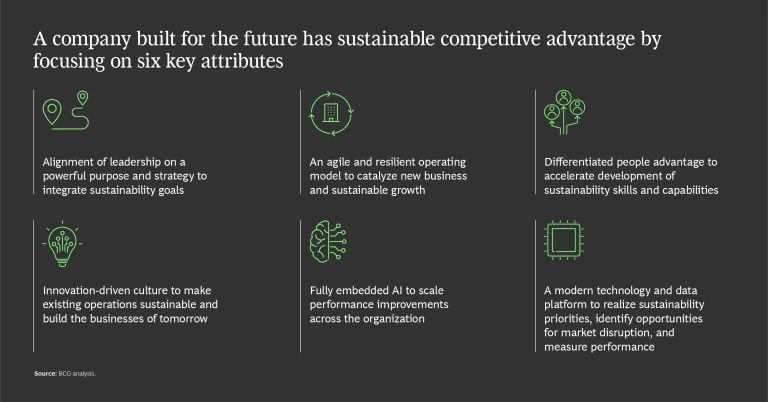 - An agile, resilient operating model that gains an advantage from sustainability, reimagining business outcomes and developing new offerings that can catalyze sustainable growth. Companies need to create new strategies and options for the future, balancing risks and changing economics. Sustainability metrics need to be integrated into business models and employees’ roles.