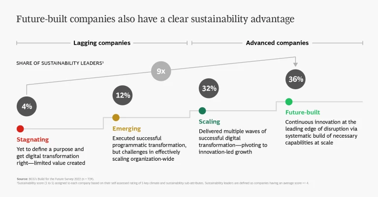 One key finding from our research is that 36% of future-built companies are also leading in terms of sustainability, compared with just 4% for stagnating companies—a nine-fold increase. What separates these future-built companies? We have analyzed the differences and developed a Build for the Future framework. It includes six elements, each of which has a sustainability component: