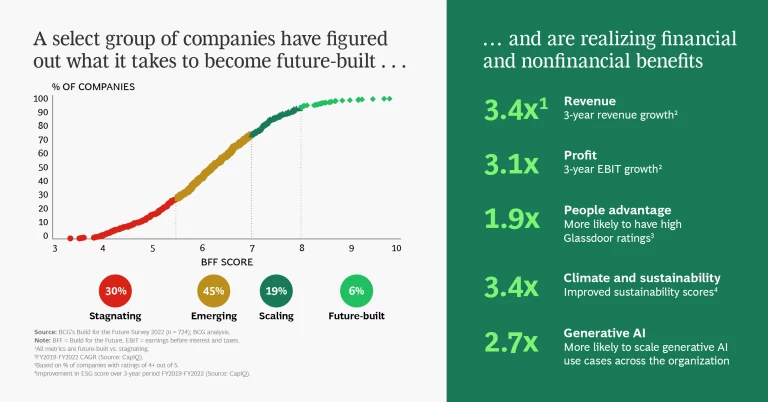 Companies are setting sustainability goals, but many are finding it much harder to generate real gains in terms of overall impact. One common challenge is that organizations often try to solve the sustainability challenge separately, instead of embedding it into their business model. A growing body of BCG research shows that companies that build for the future are taking a more holistic approach to sustainability that is yielding financial and nonfinancial benefits. By building up their capabilities across a wide range of areas, these companies create a competitive advantage from sustainability, even as they solve other business challenges.