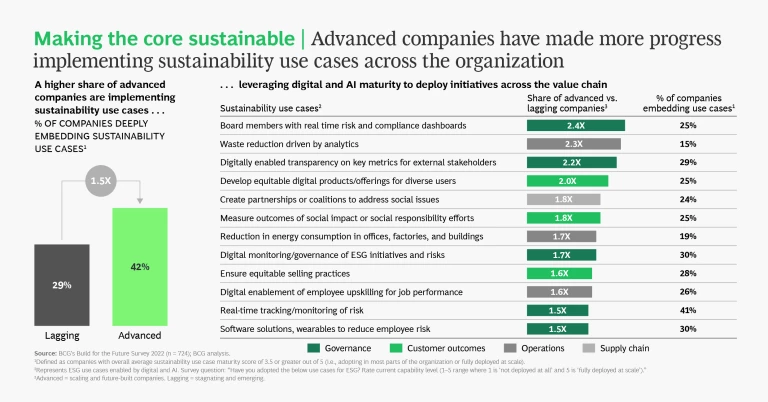 - A modern tech and data platform, to quickly identify sustainability priorities, rapidly identify opportunities, mitigate risks, and measure performance. Leaders should constantly assess and implement promising new digital solutions.