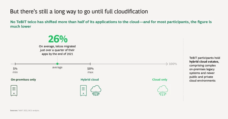One surprise is where telcos are in their cloud journey. While 75% of TeBIT participants have initiated a shift to the cloud since 2019, most are still, in practical terms, in the early stages. On average, telcos migrated just 26% of their applications by the end of 2021, and no participant crossed the 50% mark. Why the holdup? One explanation is—again— telcos’ legacy IT landscape. With a broad variety of interdependencies and often layers of customization added over the years, it‘s a natural bottleneck. Moving applications from a legacy environment to a cloud platform is taking time.