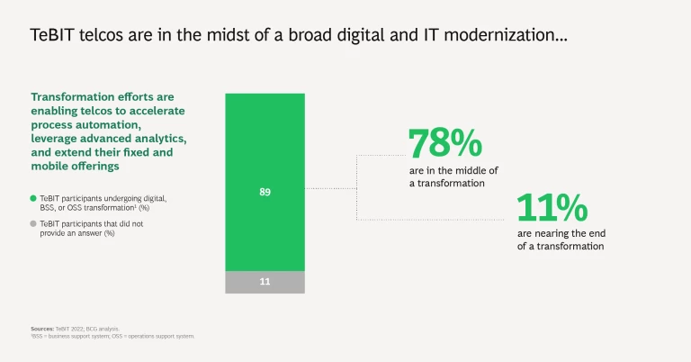 For telcos, this isn’t a news flash. One of the key motivators for transformation has been to shift to more flexible, scalable, and efficient ways of working. By modernizing their IT, telcos can accelerate process automation, better leverage data and analytics, and take advantage of emerging technologies and business models. And they’re well on their way: 78% of TeBIT participants are in the middle of a digital transformation, business support system transformation, or operations support system transformation. Another 11% are even further along, nearing the end of their transformations. If these efforts pay off, telcos can hit the trifecta of boosting revenues, lowering costs, and improving efficiency.