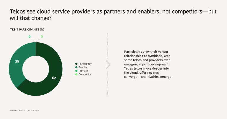 The bigger question is what the future holds for the relationship between telcos and vendors—especially the large global cloud service providers. Right now, telcos tend to view that relationship as symbiotic: 62% of TeBIT participants perceived cloud service providers as partners and allies (involved in decision making, in some cases even jointly developing cloud-based services); the rest saw them as enablers (providing the capabilities and functionality that let telcos harness the power of the cloud). Notably, none viewed their vendors as competitors.