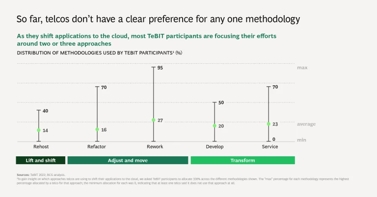 Overall, telcos don’t seem to have a clear preference for any one method. Yet we did see some patterns. The participants that are most advanced in their cloud migrations tend to rework their existing applications or develop all-new ones. Telcos that are just beginning their migrations, meanwhile, typically employ the full range of methodologies—in effect, trying them all. This suggests that telcos just starting their migrations might want to follow a more focused playbook—centered around the methodologies favored by the early adopters.
