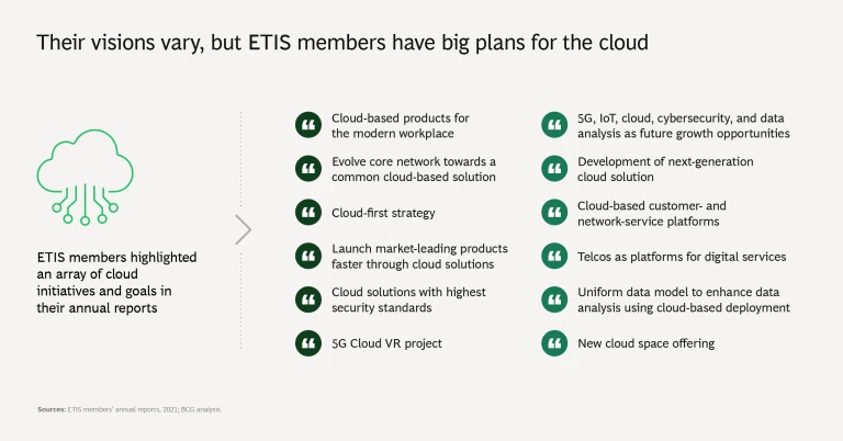 Increasingly, telcos see the cloud as the special sauce that makes their transformations come together. ETIS members’ annual reports spotlight an array of cloud initiatives and goals: new cloud products, cloud-based customer- and network-service platforms, cloud-first strategies—the list goes on. The cloud lets telcos more easily access their data, scale the services they use (or sell), and put advanced analytics and automation to use—for example, to predict and prevent service incidents and to support customers as they choose from, and use, the telco’s offerings.
