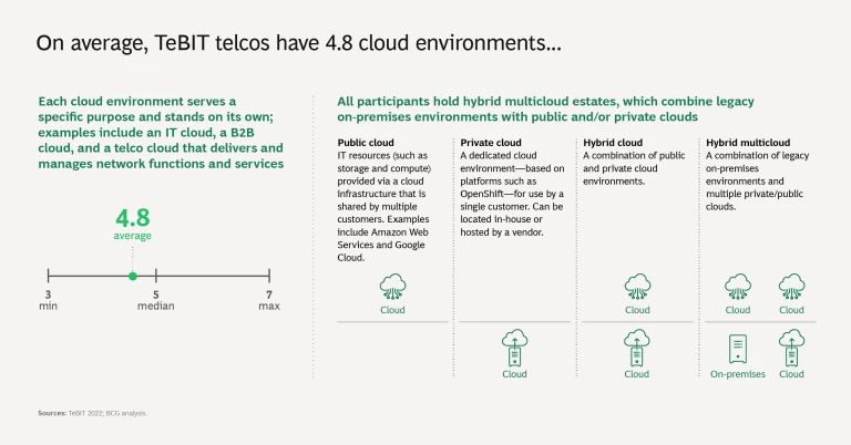This year’s telco IT benchmarking (TeBIT) study, jointly developed by ETIS—The Community for Telecom Professionals—and Boston Consulting Group, looks at the path telcos are taking as they embrace the cloud and deepen relationships with cloud providers. It finds telcos in wide agreement that they have landed on an enabler for growth. What they haven’t landed on—yet—is the optimal strategy: both to speed their cloud journey and to ensure that today’s partners aren’t tomorrow’s competitors. (See “About the TeBIT Benchmark”)