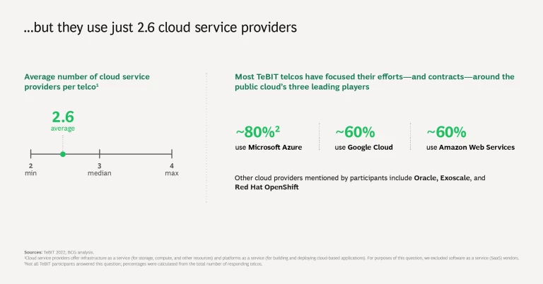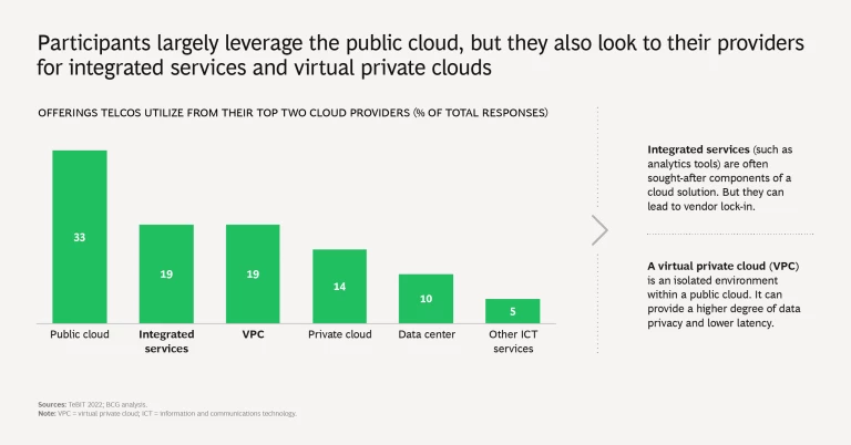 This aligns with the mixed use telcos tend to make of their platforms: on average, participants leverage each of their cloud providers in five ways. But we didn’t see a clear pattern, no “must have” capabilities that everyone is embracing. Instead, the uses—which include infrastructure services (such as compute, storage, and backup), business support systems, data and analytics, and reselling—vary from one telco to another.