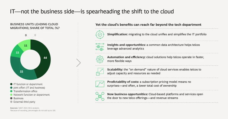 App migration is important, but telcos also need to think about where, and how, the cloud can trigger growth. That means applying a strategic mindset to the cloud. Throughout the study, we saw evidence of participants taking more of an ad hoc approach rather than looking at the big picture. Case in point: while 44% of cloud migrations have been led by telco IT departments, just 33% percent have been spearheaded jointly by IT and the business side. One could argue that it makes sense that IT is leading the charge: the cloud can simplify the IT landscape and trigger greater efficiency in operations. But those benefits are just part of what the cloud offers.