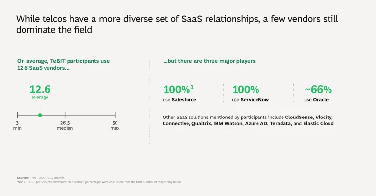 While telcos work with a small number of global cloud service providers, they use a wider array of SaaS vendors: 12.6 on average (though the number ranged widely, from 3 to 50, across TeBIT participants). This finding wasn’t unexpected, as SaaS solutions offer specific functionality and fast migration paths. But two SaaS solutions stand out: 100% of participants use both Salesforce (for customer relationship management as well as marketing and sales) and ServiceNow (for service management).
