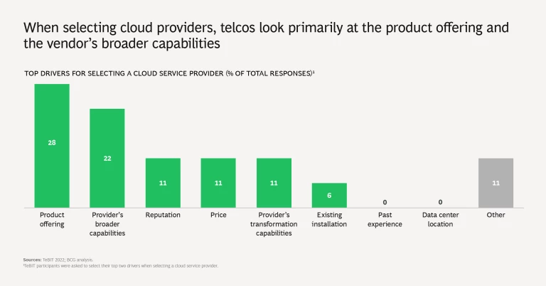 Similarly, telcos appear to be taking an opportunistic approach in how they leverage their cloud partners. On average, TeBIT participants use 2.6 cloud providers (not including SaaS vendors). The most common platforms are Amazon Web Services, Google Cloud, and Microsoft Azure. When selecting a provider, the two main drivers are the product offering (say, the ability to store data, perform analytics, and add other functionality right away) and the provider’s broader capabilities (such as helping with migration, data cleansing, or streamlining processes to boost efficiency).