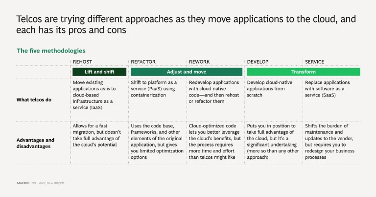 But maybe telcos could pick up the pace. Typically, there are five ways to shift a legacy application to the cloud: rehosting (lifting an application “as is” and deploying it on the cloud); refactoring (adjusting and then moving the application); reworking (redeveloping the application with cloud-native code and then rehosting or refactoring); developing cloud-native applications from scratch; and replacing a legacy application entirely with a software-as-a-service (SaaS) solution. Each of these approaches has its pros and cons. Rehosting, for example, means a fast migration, but it typically leaves you with software that doesn’t take full advantage of the cloud’s potential. Developing from scratch, by contrast, can realize that potential but it’s a significant undertaking.