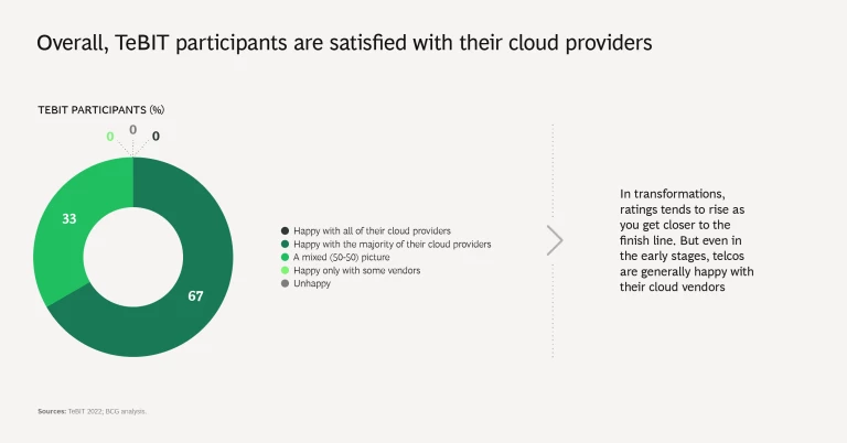 Overall, telcos expressed satisfaction with their cloud providers: 67% said they were happy with the majority of their vendors, while the rest said the picture was mixed, closer to a 50-50 split. Tellingly, no participants said they were happy with just a minority—or none—of their vendors. That’s significant, as one lesson from transformations is that satisfaction tends to rise as you get closer to the goal line. By then, you’ve worked out many issues and are starting to see a payoff. So it bodes well that telcos are generally happy now, when there is still a way to go.