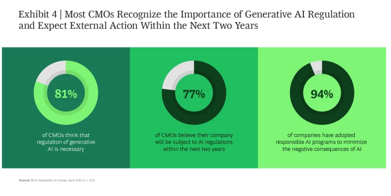 Most CMOs in our survey see AI regulations as inevitable, and the vast majority have undertaken some form of self-regulation. (See Exhibit 4.)