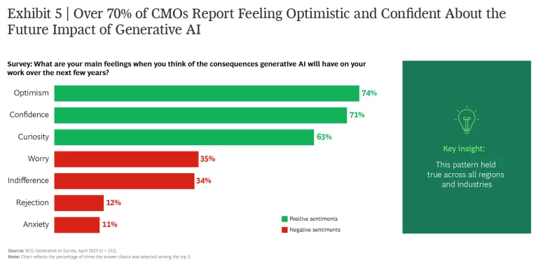 CMOs in our survey were overwhelmingly optimistic and confident about the future impact of GenAI. When asked to select the words that best describe their feelings about GenAI, at least 70% of CMOs listed optimistic and confident among their top three. (See Exhibit 5.) More importantly, this optimism is pervasive. Every country and every sector showed similar results.