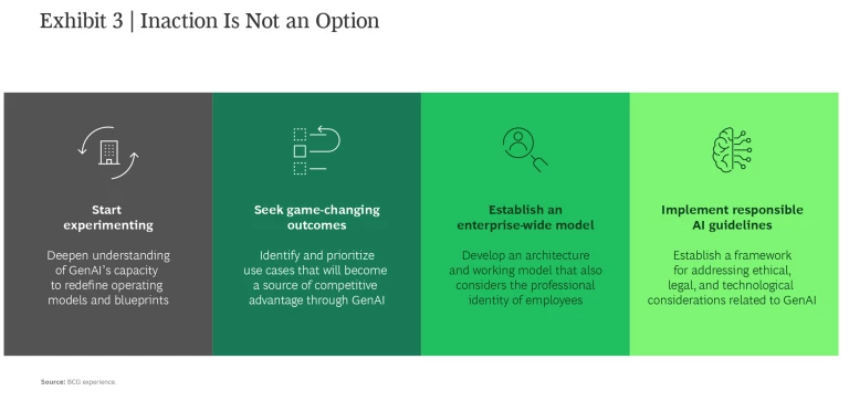 Implement responsible AI guidelines. If an organization prohibits GenAI use or lacks centralized guardrails, one of two things is probably happening. Either employees are using GenAI anyway—professionally or privately—and recognizing opportunities for productivity improvements or the organization is falling behind competitors that are already pursuing and may be achieving double-digit-percentage gains in productivity.
