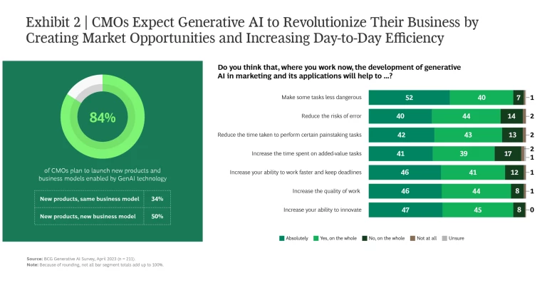 One key finding from our survey is that GenAI works. Most CMOs see positive results right away, with 93% reporting a positive or very positive improvement in how they organize their work and 91% reporting a positive or very positive impact on their efficiency. Our own initial observations suggest that GenAI’s low cost and ease of use can yield productivity gains of as much as 30%.