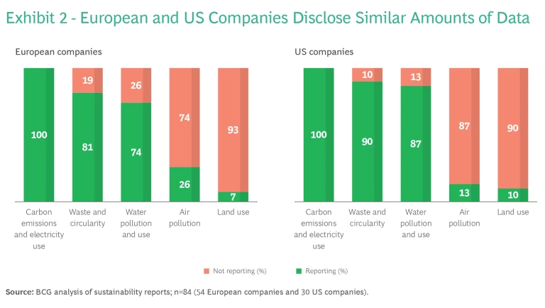 Companies in Europe and the US disclose similar amounts of data across topics. (See Exhibit 2.)