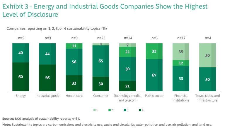 In both regions, however, disclosure varies notably among industries. (See Exhibit 3.) The energy and industrial goods sectors stand out for their extensive disclosure of impacts. We found that approximately 60% of energy companies and 50% of industrial goods companies report on at least four material topics (including carbon emissions). In contrast, financial institutions and the public sector perform the least comprehensive reporting (probably in part because of the nature of their operations).