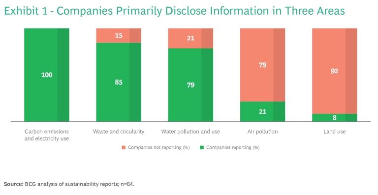 Disclose impacts across material topics. Today, all companies must report on their carbon emissions, so every company we studied discloses this data. The number of companies that provide voluntary disclosures on the four other potentially material topics varies. Most report on waste and circularity (85%) and water pollution and use (79%), while relatively few report on air pollution (21%) and land use (8%). (See Exhibit 1.) (For more on the reporting by leading companies on each of these topics, see “How Top Companies Are Disclosing Impacts.”)