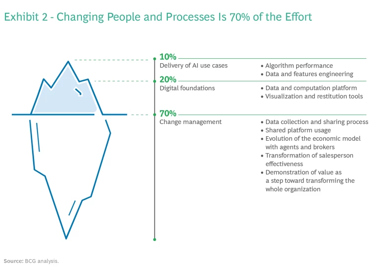Although we’ve demolished the myths, it’s essential to recognize that there are genuine challenges to overcome. They are not only technical: for most AI transformations, just 30% of the effort involves technical tasks such as building a data platform and developing and improving the performance of algorithms—the tasks most people associate with AI development. A full 70% of the undertaking is focused on change management. (See Exhibit 2 for more details.)