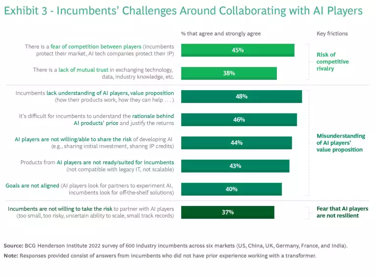 When we spoke to decision-makers at incumbents that had not collaborated with a transformer about how they viewed AI startup or scaleup collaboration, time and again they reported frictions in three key areas: risk of competitive rivalry, not understanding AI players’ value proposition, and concerns about AI players’ resilience. (See Exhibit 3).