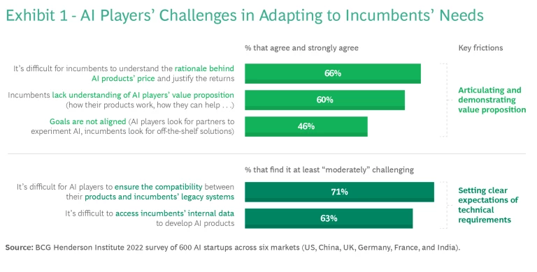 Our survey of 600 incumbent business leaders and 600 AI startups and scaleups found that many AI players are struggling to adapt their value proposition to incumbents’ needs—or to articulate their value proposition effectively. (See Exhibit 1 and methodology.) Incumbent leaders point to a lack of trust and understanding of AI players and their offerings.