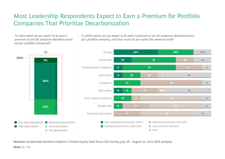 This has been a hard question to answer since, historically, carbon has not been consistently priced into asset valuations. Even so, many private market investors say carbon is already affecting their decisions. According to a survey of leaders in private markets by BCG and the Sustainable Markets Initiative’s Private Equity Task Force, about 70% report high or very high expectations they will earn a premium for a portfolio company that prioritizes decarbonization (see the exhibit), and about 65% have high or very high expectations they will be penalized if a portfolio company makes insufficient progress.