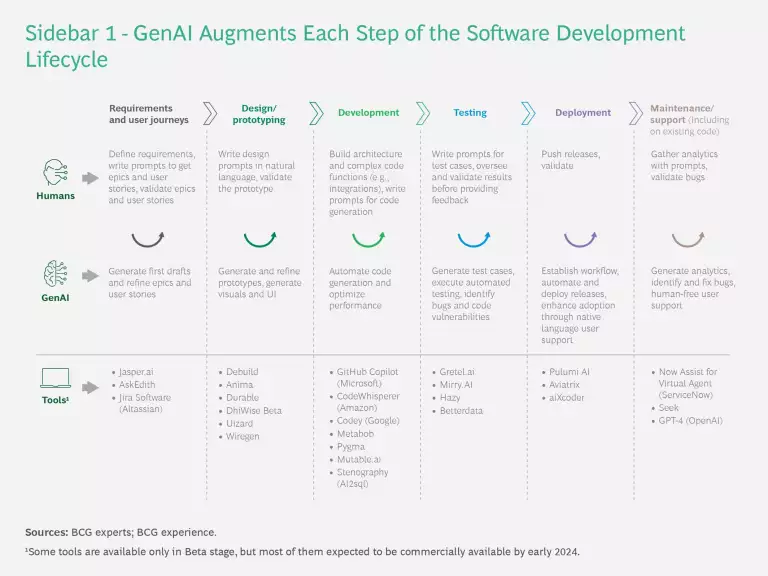 Building and Maintaining Apps. All steps of the software development lifecycle can be augmented with commercial tools available today. For example, one software company saw developers’ completed tasks jump more than 40% in the three months after implementing an AI productivity tool. (See “Augmenting Software Development.”)