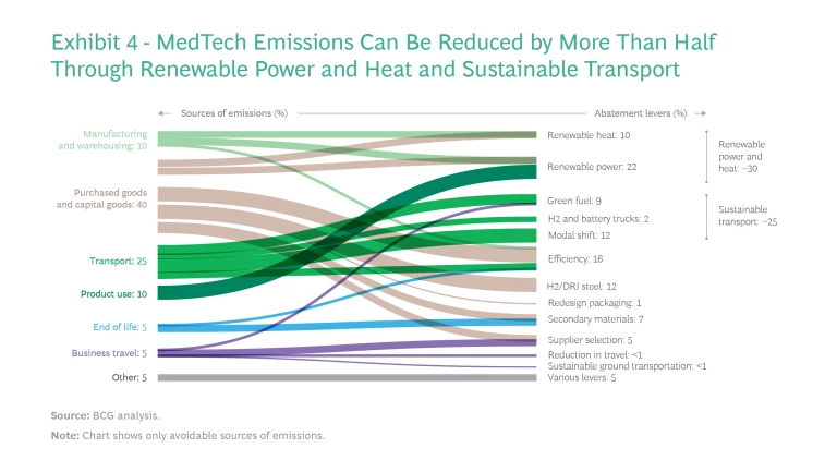 After calculating baseline emissions and setting targets, MedTech companies must explore reduction tactics. We have found that firms can cut their carbon emissions in half by using renewable power and heat in manufacturing, switching to greener fuels in transportation across their activities, and urging their suppliers and customers to do the same. (See Exhibit 4.)