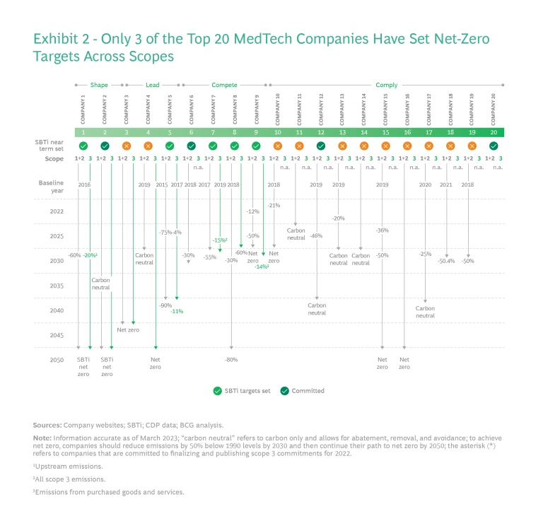 To reduce global warming to 1.5 degrees Celsius above preindustrial levels—the goal set in the Paris Climate Agreement—companies should at a minimum aim for net zero across scope 1, 2, and 3. Based on pledges made as of March 2023, MedTech players have some catching up to do. (See Exhibit 2.) Nineteen of the top 20 MedTech companies have set emissions reduction targets. But only eight, or 40%, included scope 3 emissions (which are emissions outside of the companies’ own control, such as carbon generated by suppliers and end users). And only three have net-zero targets that encompass all three scopes. By contrast, nine of the top ten pharmaceutical companies have established full-scope reduction targets, and seven have published full-scope net-zero goals.