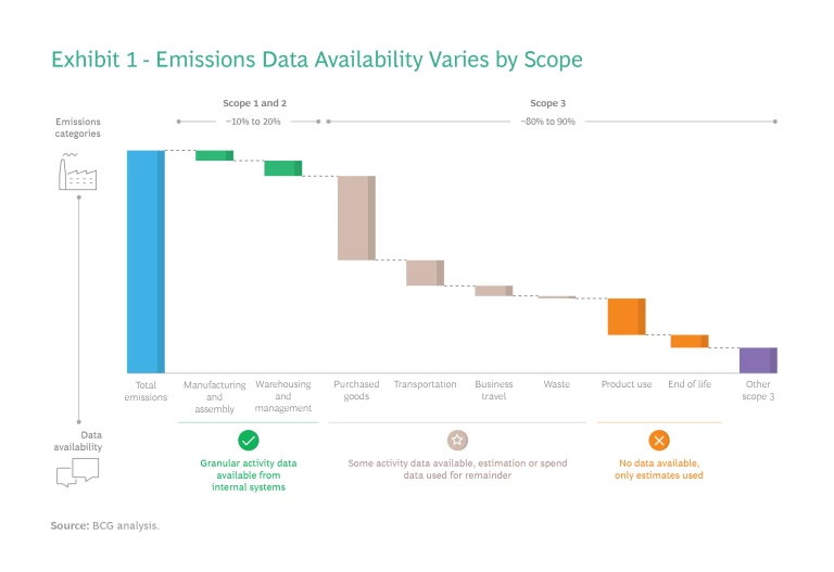 For scope 1 and 2, granular emissions data is relatively easy to obtain internally. (See Exhibit 1.) However, scope 3 output from suppliers and customers, which typically accounts for 70% to 90% of MedTech companies’ emissions, is the hardest to measure because specific emissions data (which would form the core of an activity-based analysis) is often lacking. As a result, to estimate scope 3 emissions, companies will choose a spend-based approach when data is available to do so. This involves multiplying the cost of a product or service by an industry average emissions factor per dollar. But this approach can lead to inaccurate outcomes because the same emissions factor may be applied to, for instance, plastic used for MedTech products or consumer products as well as recycled and unrecycled plastics. Spend-based data is often unavailable and companies are forced to estimate their emissions.