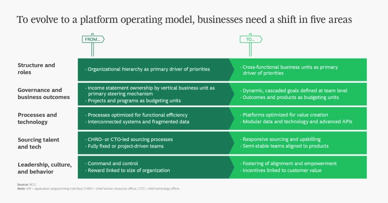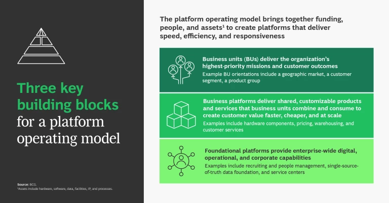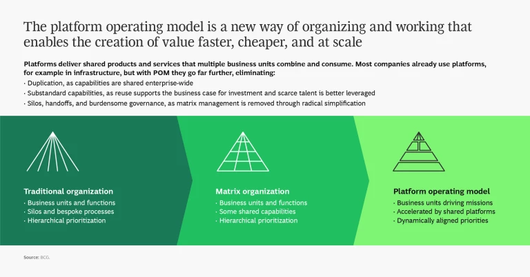 One way to ensure agility and resilience is to adopt a platform operating model (POM). The POM is a way of organizing and working that brings together funding, people, and assets to create “platforms” that deliver shared products and services across the enterprise. POM eliminates duplication, silos, and substandard capabilities, supporting the creation of customer value more quickly, cheaply, and at scale than a traditional model.