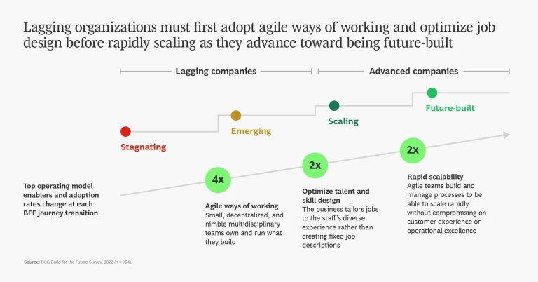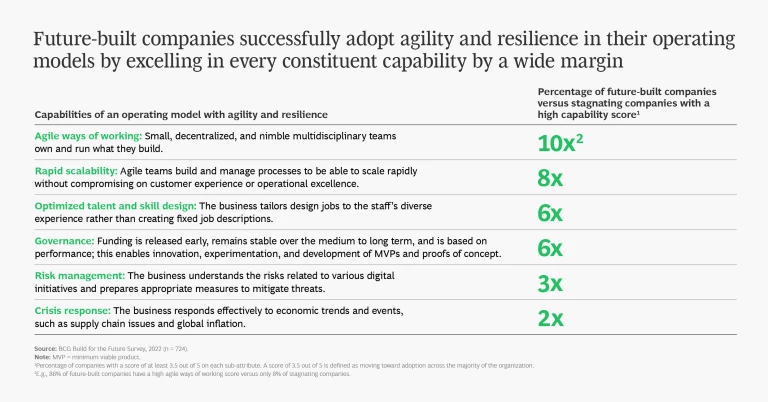 The most successful companies in our survey are outperforming the competition and thriving in the current business environment. Of these “future-built” companies, 100% have implemented an agile and resilient operating model. They have done so by excelling in every constituent capability, including agile ways of working, rapid scalability, and optimized talent and skill design. Ten times the percentage of future-built companies, for example, have a high agility score than the percentage of companies we classify as stagnating. Why? Because their decentralized, multidisciplinary, agile teams own and run what they build. (See the slideshow.)